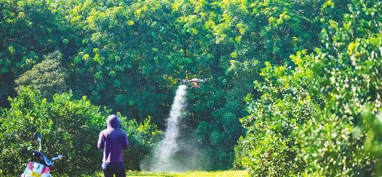 7月25日,澄邁縣福山鎮(zhèn),海南橡膠紅光分公司智能標(biāo)準(zhǔn)化澄邁福橙種植基地,伴隨著螺旋槳轉(zhuǎn)動(dòng)的嗡嗡聲,一臺(tái)無人機(jī)滿載生物防蟲劑緩緩升空,按照預(yù)設(shè)航線在福橙園上空來回穿梭。